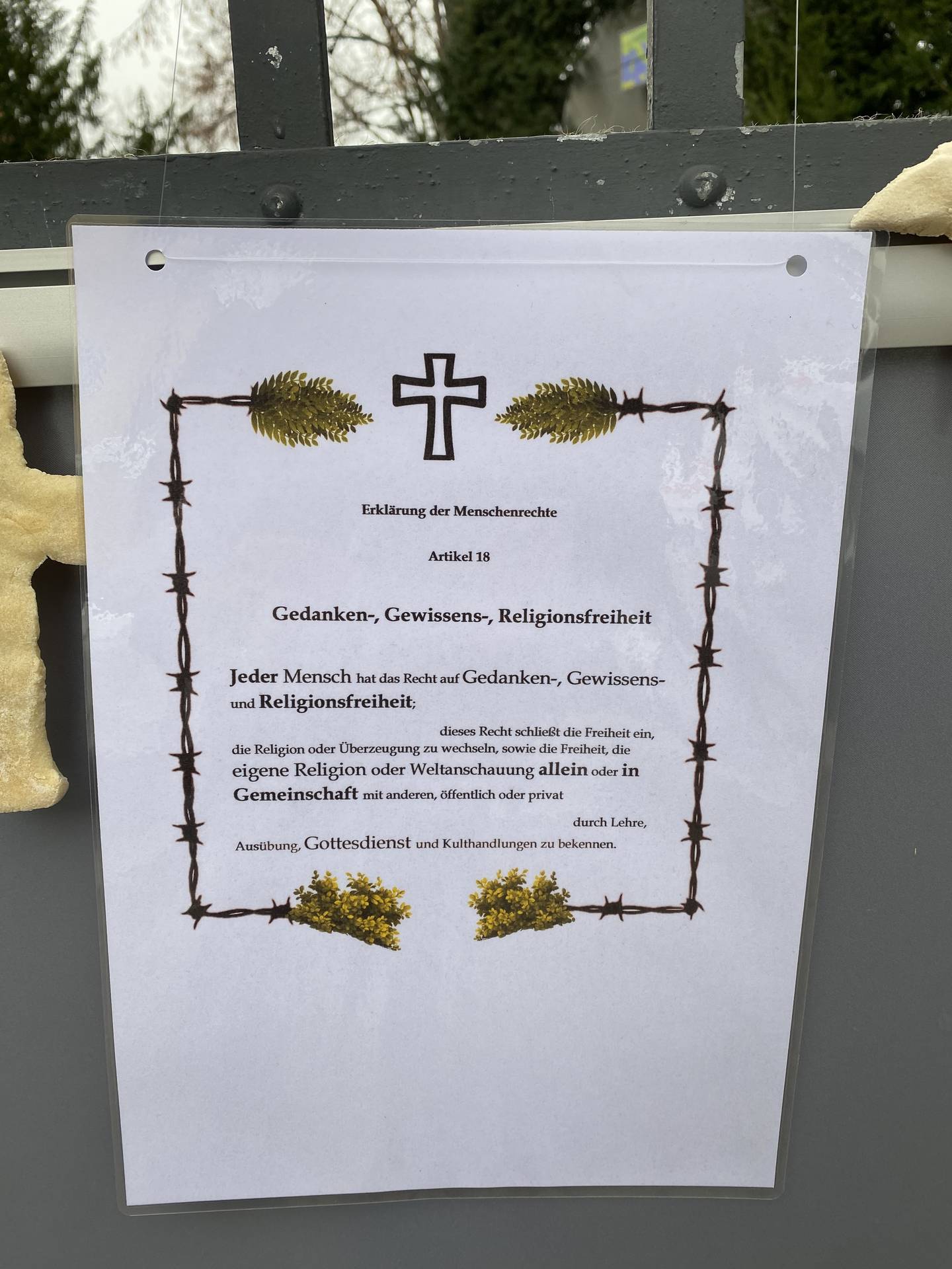 Jeder Mensch hat das Recht auf Gedanken-, Gewissens- und Religionsfreiheit; dieses Recht schließt die Freiheit ein, die Religion oder Überzeugung zu wechseln, sowie die Freiheit, die eigene Religion oder Weltanschauung allein oder in Gemeinschaft mit anderen, öffentlich oder privat durch Lehre, Ausübung, Gottesdienst und Kulthandlungen zu bekennen.