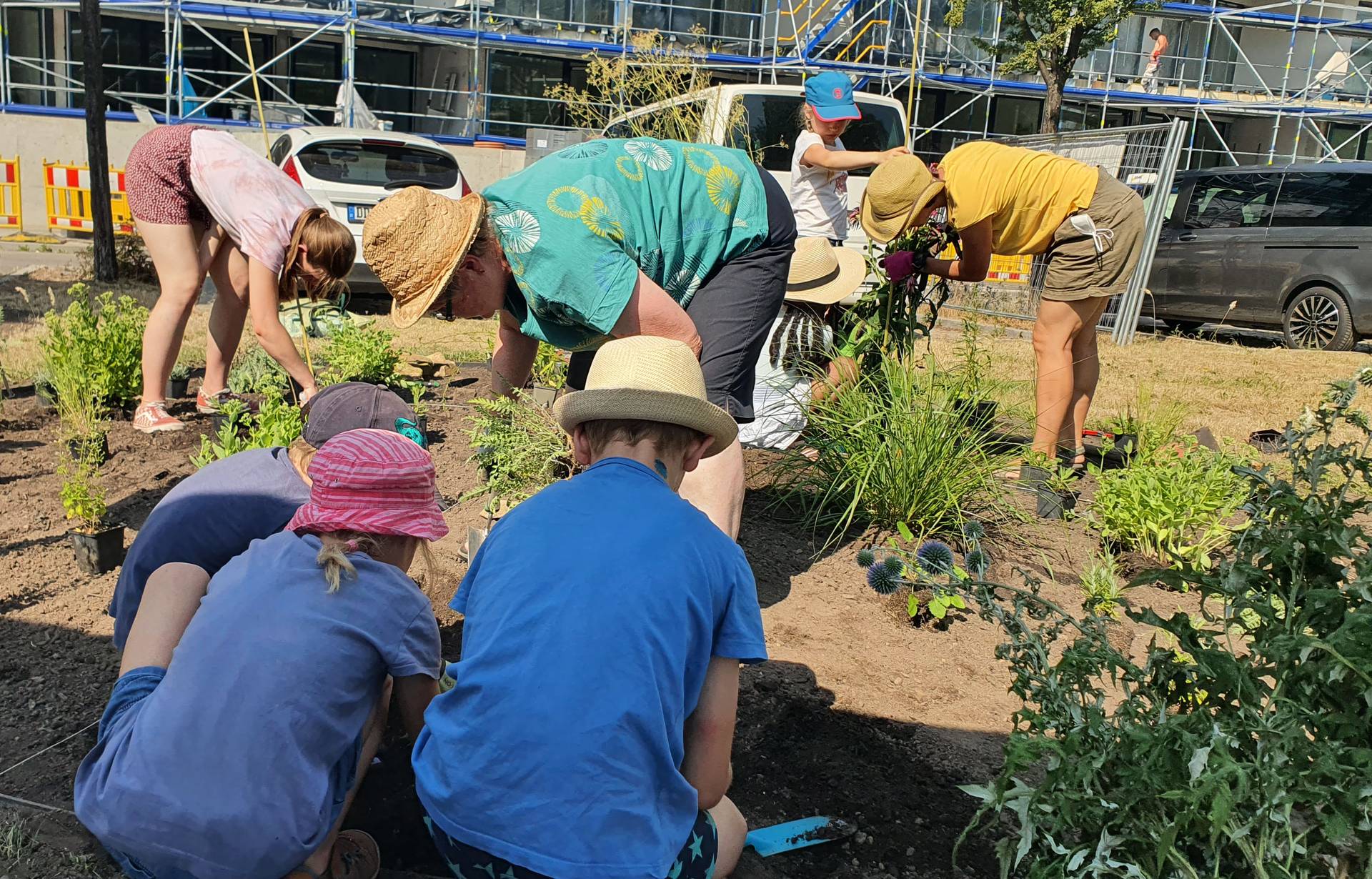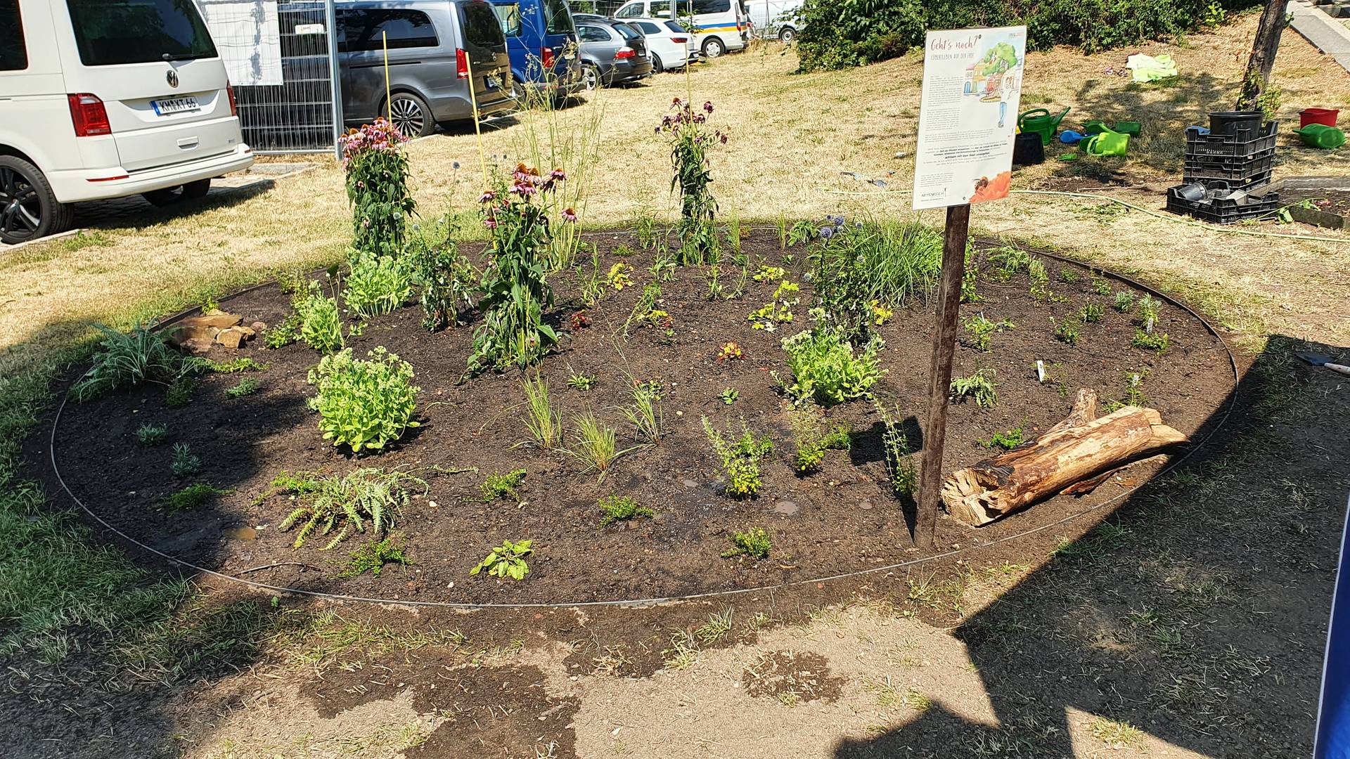 Der Hitze zum Trotz haben eine Gruppe Kinder, sehr freundliche Leute vom Grünflächenamt und ein paar Helfer mit Geduld und grünem Daumen Steine zum Haufen geschichtet, einen Baumstamm für Wildbienen vorbereitet und jede Menge Pflanzen in die Erde gebracht.