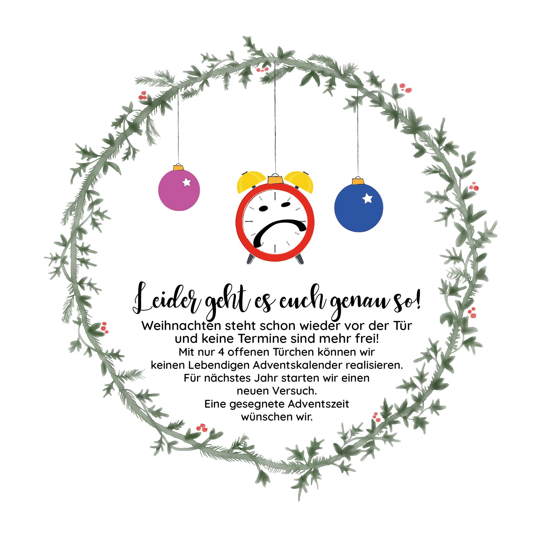 Leider haben sich nur 4 offene Türchen gefunden. Deshalb kann der Lebendige Adventskalender nicht durchgeführt werden.