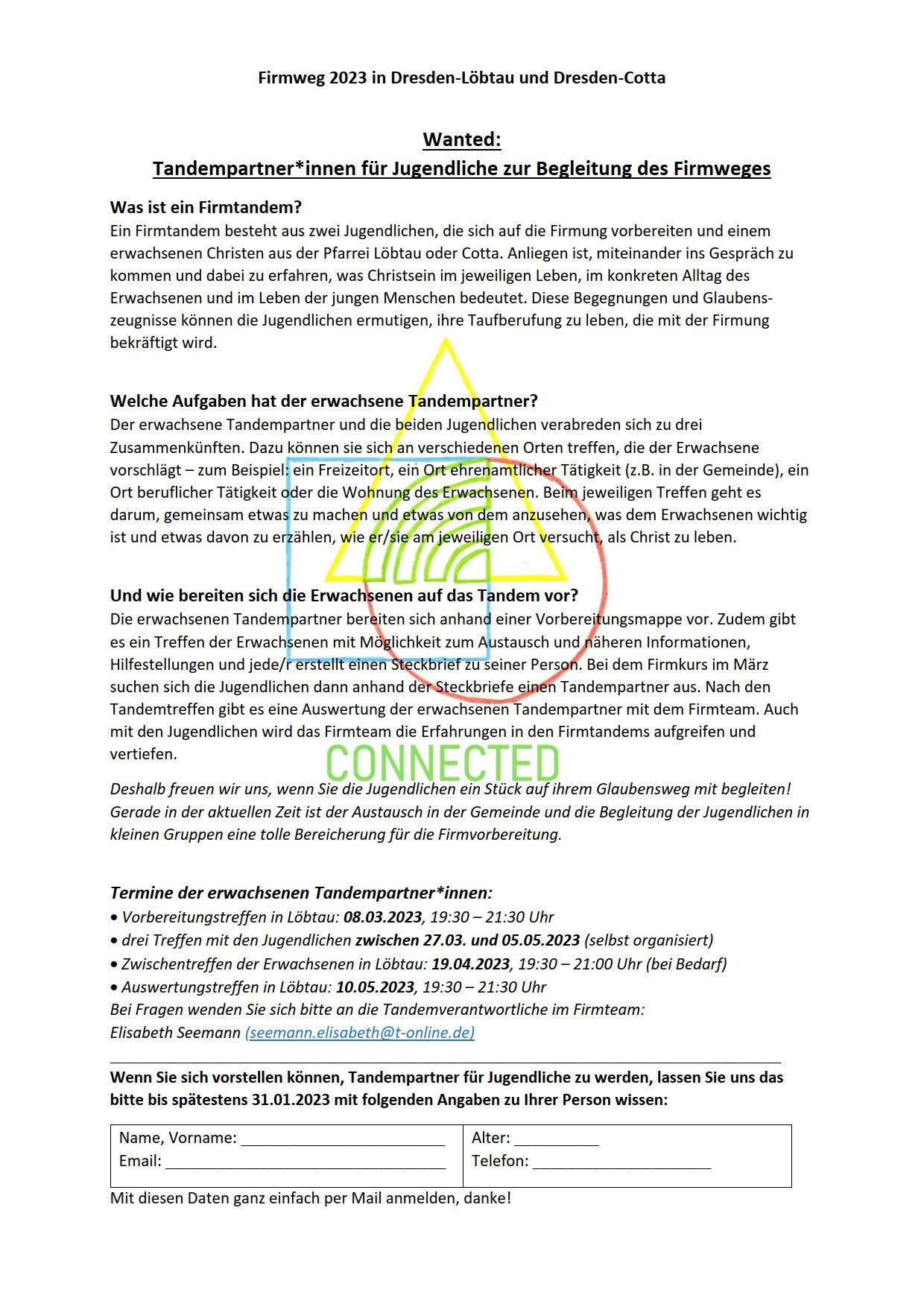 Wie auch in den letzten Jahren gehört zu dieser Vorbereitung auf das Leben als Christ die Mitarbeit der Gemeinde. Wir möchten, wie schon in der vergangenen Zeit auch im Jahr 2023 die Jugendlichen in Tandems mit einem/r Erwachsenen Christen/ Christin ins Gespräch über das Leben und Christsein bringen. Zu einem Tandem gehören immer 2 Jugendliche aus dem Firmkurs und ein Erwachsener aus den Gemeinden. Die Tandems finden im nächsten Jahr von Ende März bis Anfang Mai statt. Hierzu finden sich die Tandems 2-3 Mal bei selbst organisierten Treffen zusammen. Beim jeweiligen Treffen geht es darum, gemeinsam etwas zu machen und etwas von dem anzusehen, was dem Erwachsenen wichtig ist und etwas davon zu erzählen, wie er oder sie am jeweiligen Ort versucht, als Christ zu leben. Ziel ist es, ins Gespräch zu kommen und Erfahrungen auszutauschen.