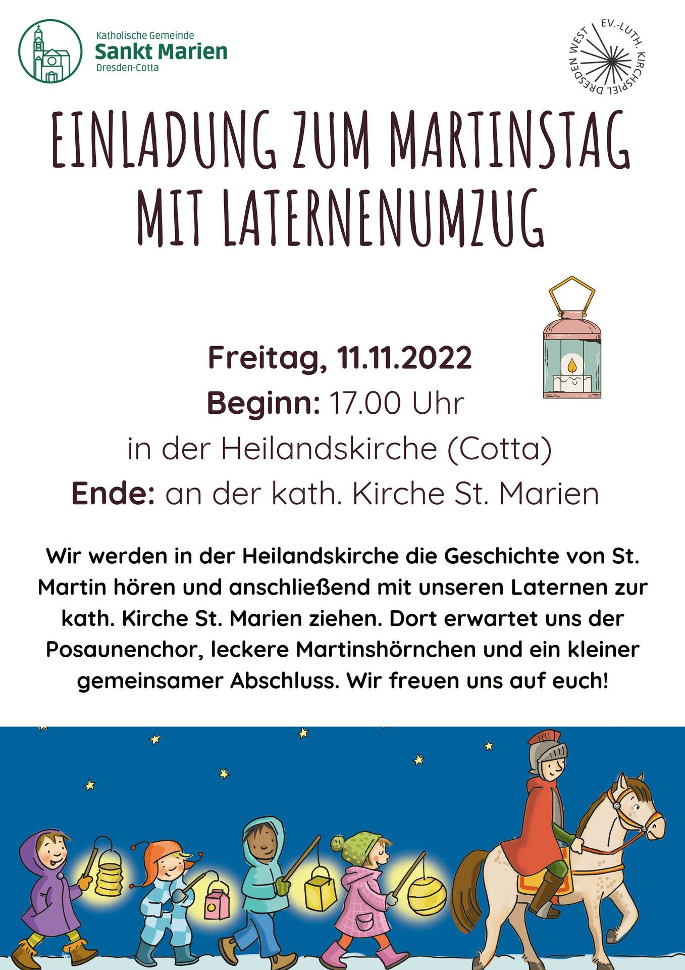 Martin hören und anschließend mit unseren Laternen zur kath. Kirche St. Marien ziehen. Dort erwartet uns der Posaunenchor, leckere Martinshörnchen und ein kleiner gemeinsamer Abschluss.