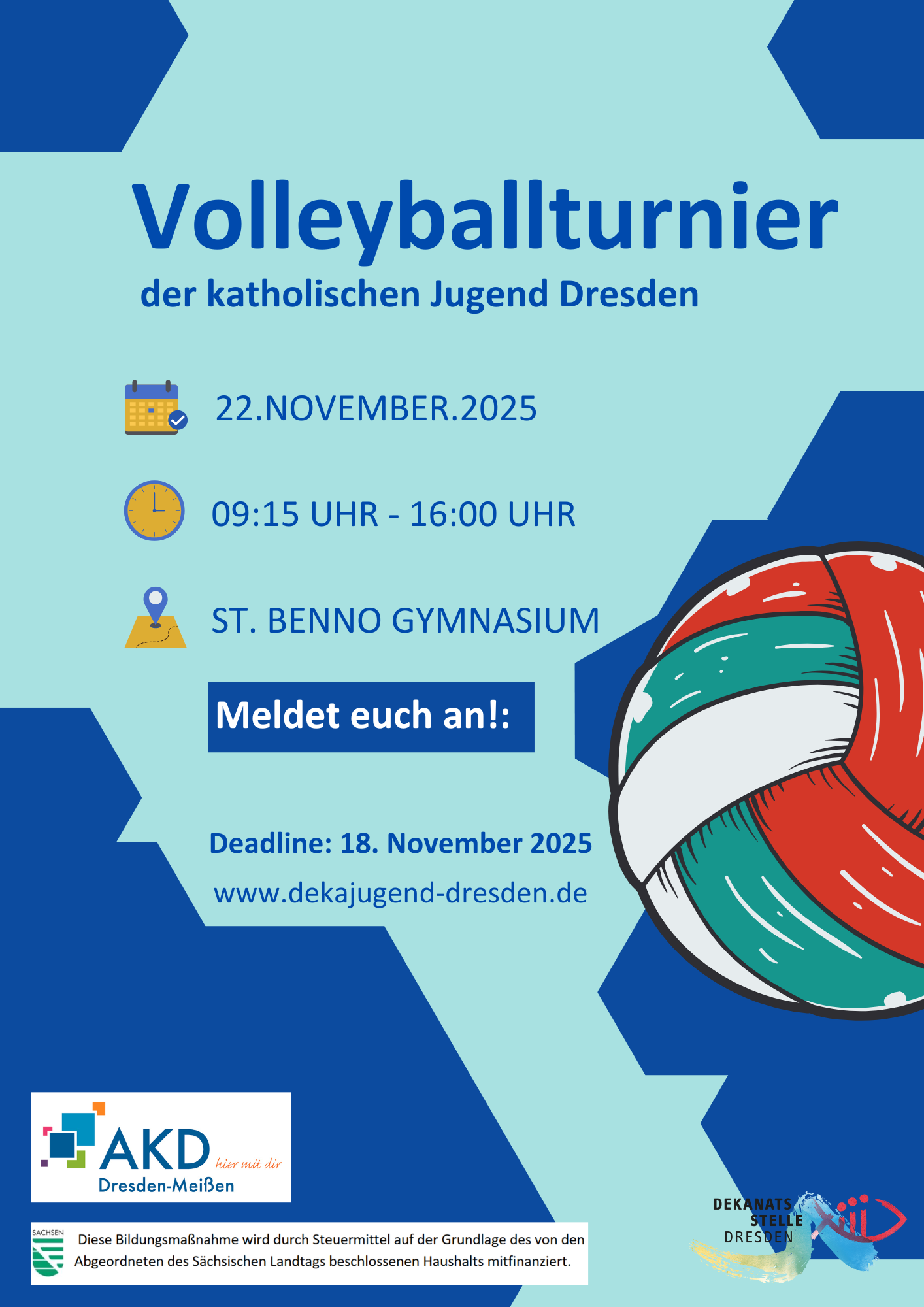 - zum Jugend-Volleyballturnier 22.11.2025 09.15 – 16.00 Uhr im St. Benno-Gymnasium ein. Eine Anmeldung ist unter www.dekajugend-dresden.de bis zum 18.11.2025 möglich.