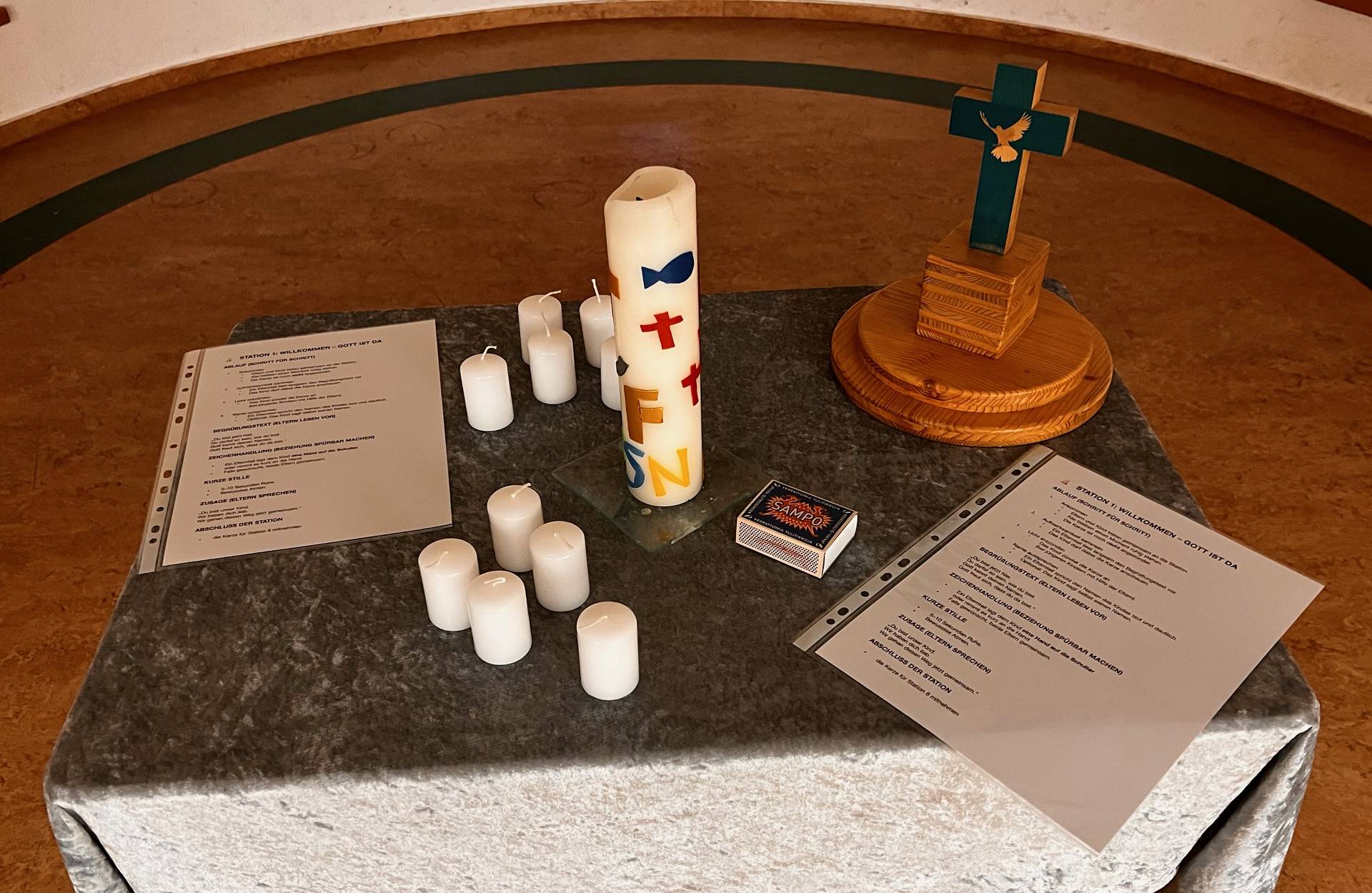 Anschließend machten sich die Familien auf den Weg durch den Gemeindesaal. In acht liebevoll gestalteten Stationen konnten Kinder und Eltern miteinander ins Gespräch kommen, nachdenken, zuhören und Zeichen setzen.